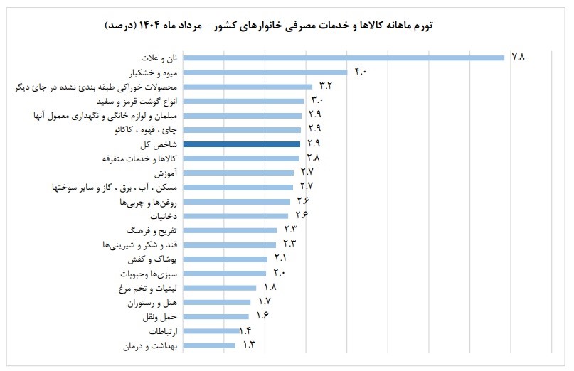 در مرداد ماه 1404 ، تورم ماهانه خانوارهای کشور برابر 2.9 درصد بوده است. تورم ماهانه برای گروه‌های عمده «خوراکی‌ها، آشامیدنی‌ها و دخانیات»، 3.9 درصد و برای گروه عمده «کالاهای غیرخوراکی و خدمات»، 2.3 درصد بوده است.