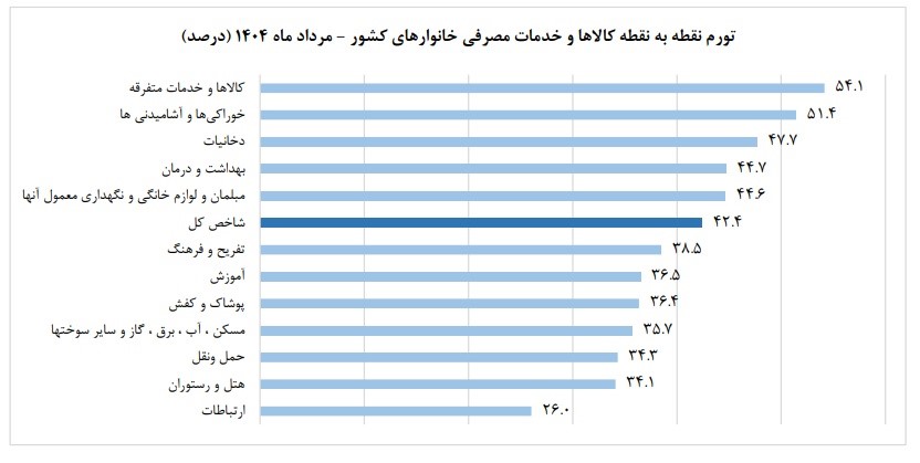 در مرداد ماه 1404 ، تورم نقطه به نقطه خانوارهای کشور، 42.4 درصد بوده است؛ یعنی خانوارهای کشور به طور میانگین، 42.4 درصد بیشتر از مرداد ماه 1403 برای خرید یک «مجموعه کالاها و خدمات یکسان» هزینه کرده اند. تورم نقطه به نقطه مرداد ماه 1404 در مقایسه با ماه قبل، 1.2 واحد درصد افزایش داشته است.