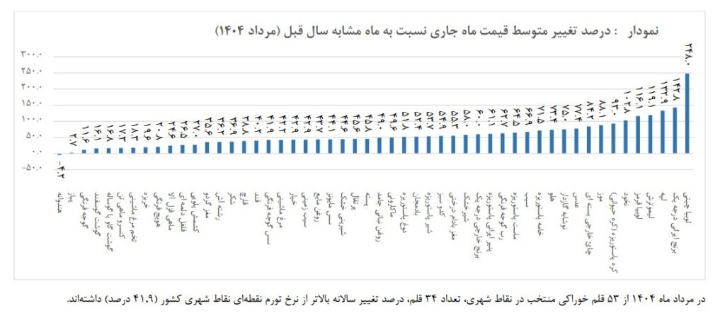 در مرداد ماه 1404 تغییرات متوسط قیمت اقلام خوراکی منتخب برای گروه‌های مختلف کالاهای خوراکی در مناطق شهری کشور به‌شرح زیر است: