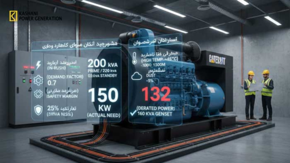 شرایط محیطی مستقیماً روی توان واقعی ژنراتور تأثیر می‌گذارند. دمای بالا، ارتفاع زیاد و رطوبت، توان را کم می‌کنند. استاندارد ISO 3046 می‌گوید هر ۵.۵ درجه بالای ۴۰ درجه سانتی‌گراد، توان ۱ درصد افت می‌کند. در شهرهای جنوبی ایران مثل بندرعباس، دما اغلب به ۴۸–۵۰ درجه می‌رسد. این یعنی افت ۲–۳ درصدی توان. در ارتفاع بالای ۱۰۰۰ متر (مثل تبریز یا کرمانشاه)، هر ۳۰۰ متر ارتفاع، توان ۳ درصد کاهش می‌یابد. گردوغبار هم فیلتر هوا را مسدود می‌کند و توان را پایین می‌آورد. همیشه باید فاکتور Derating را در محاسبه اعمال کرد. نادیده گرفتن این عوامل، عملکرد ضعیف در شرایط واقعی ایجاد می‌کند.