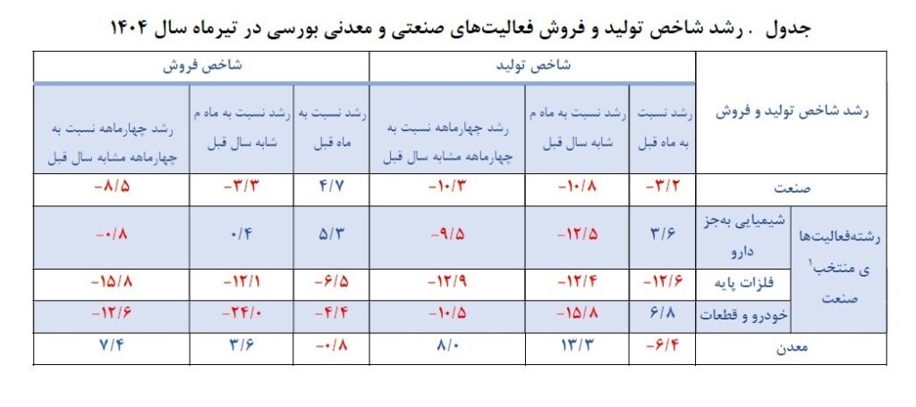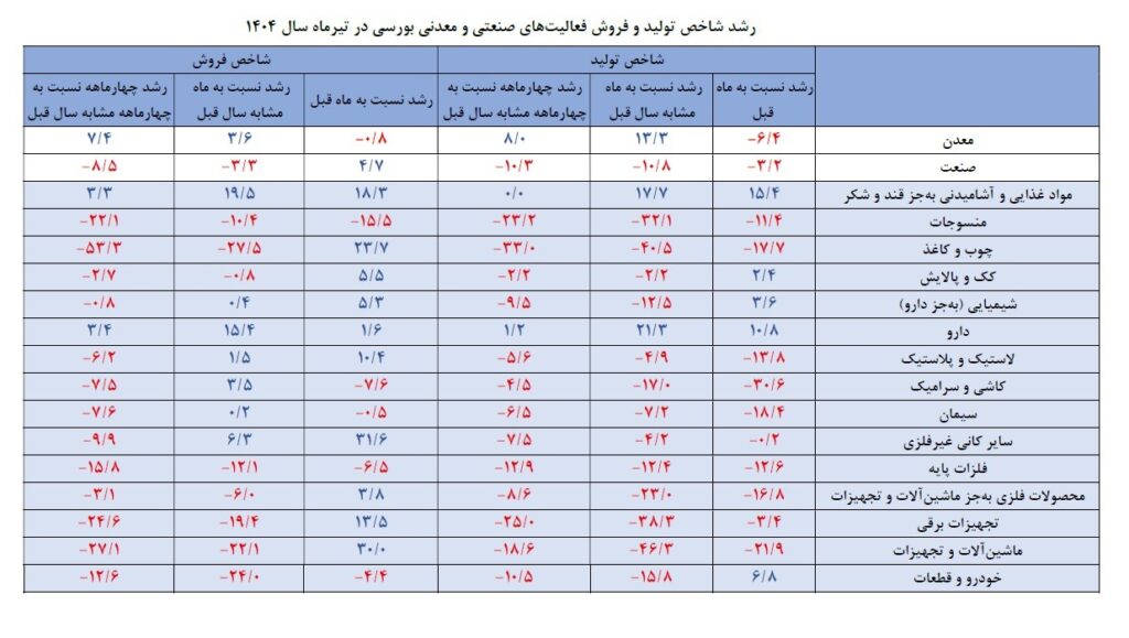 در بخش فروش، صنایع غذایی و آشامیدنی به جز قند و شکر، چوب و کاغذ و دارو رشد بیشتری را ثبت کرده‌اند، اما گروه خودرو و قطعات و همچنین فلزات پایه بیشترین کاهش فروش را تجربه کرده‌اند به نحوی که شاخص تولید در گروه «خودرو و قطعات» نسبت به تیر سال گذشته 15.8 درصد کاهش یافته است. مقایسه ماهانه نیز نشان می‌دهد که برخی از این روندها تکرار شده و همچنان تفاوت معناداری میان رشته‌فعالیت‌ها وجود دارد؛ به گونه‌ای که رشد ماهانه تولید و فروش عمدتاً در گروه‌های دارویی و غذایی متمرکز بوده و افت‌های شدیدتر در صنایع فلزی، کاشی، سرامیک و خودروسازی دیده می‌شود.