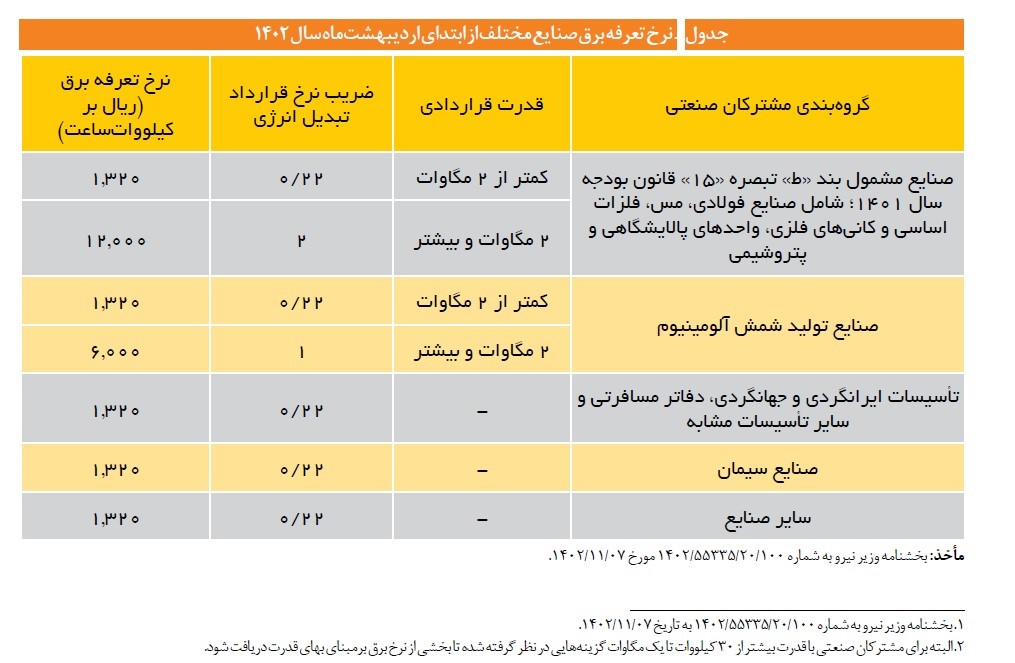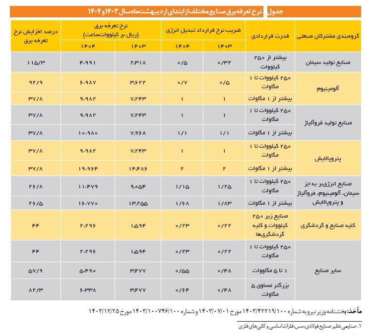 اصلاح تعرفهها پیامدهای متفاوتی به همراه داشته است. از یک سو، درآمد وزارت نیرو از فروش برق به صنایع بهشدت افزایش یافته و از ۱۶۳ هزارمیلیارد ریال در سال ۱۴۰۰ به بیش از ۵۳۵ هزارمیلیارد ریال در سال ۱۴۰۲ رسیده است. این رشد درآمد، تا حدی به بهبود وضعیت مالی صنعت برق و کاهش بدهیهای این بخش کمک کرده است. از سوی دیگر، بررسی هزینههای تولید صنایع نشان میدهد که افزایش تعرفه برق، بار سنگینی بر دوش تولیدکنندگان نگذاشته است. در اکثر صنایع، سهم برق از هزینههای تولید کمتر از ۵ درصد بوده و حتی در صنایع انرژیبری مانند فلزات اساسی نیز این سهم بهطور متوسط ۳.۱ درصد گزارش شده است.